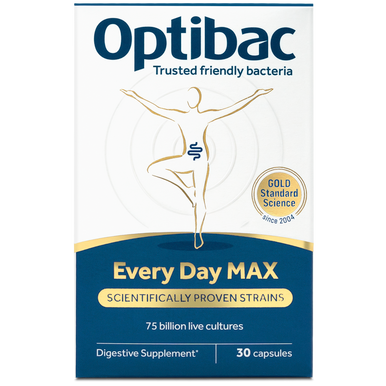 Person holding a box of Optibac Every Day MAX probiotics, featuring 75 billion live cultures per capsule.