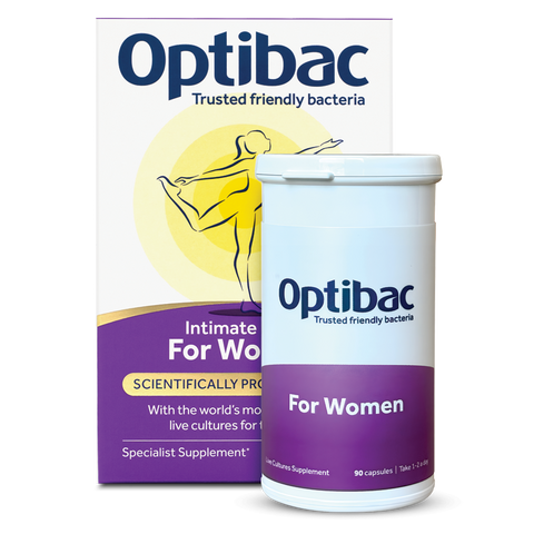 A person holds a small white capsule and a jar labeled "Optibac For Women" against a blurred green background.
